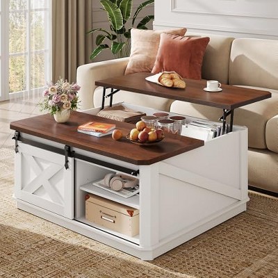 DEXYLLO Lift Top Coffee Table, 39.4" Farmhouse Coffee Table with Large Hidden Storage Compartment, Sliding Barn Doors