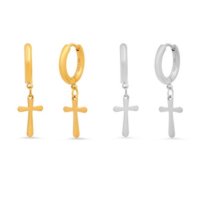 Steeltime Set of 2 Black Ion Plated Dangling Cross Charm Huggie Hoop Earrings (18k Gold Plated)