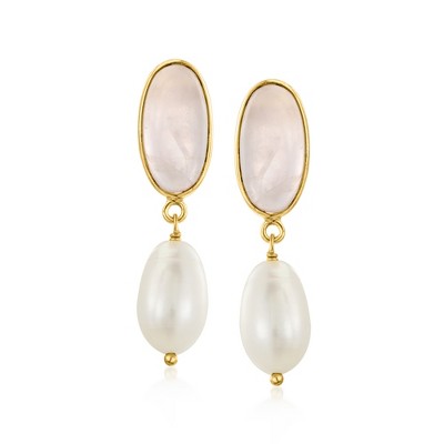 Ross-Simons 8x13mm Cultured Pearl and 7.00 ct. t.w. Rose Quartz Drop Earrings in 18kt Gold Over Sterling