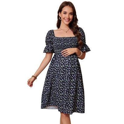 Clearlove Women's Floral Print Square Neck Shirred Puff Sleeve Maternity Dress Nursing Friendly Bump Flowy Maxi