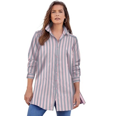 Roaman's Kate Long-Sleeve Crisp Cotton-Blend Button-Front Tunic 40 W, Pink Multi Stripe