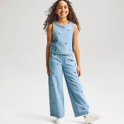 Girls' Mid-Rise Pull-On Denim Embroidered Wide Leg Pants - Cat & Jack™ Blue