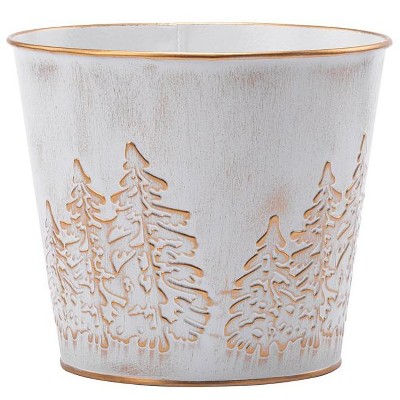 Napco Embossed Forest Trees with Hard Liner - 6 Inch Distressed White Metal Round Standing Indoor or Outdoor Planter Cache Pot Cover