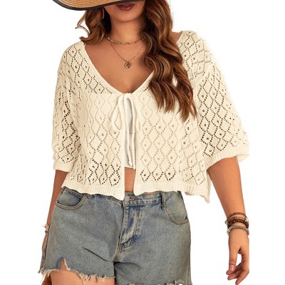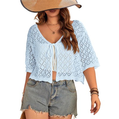 Clearlove Womens Crochet Cardigan Casucal Tie Front Shrugs Sweaters Short Sleeve Knit Cropped Cardigans Tops