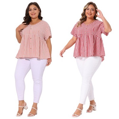 Women's Plus Size Plaid Gingham 1950s V-Neck Peplum Babydoll Two Piece Tops with Button Detail - Agnes Orinda