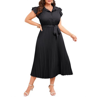 Clearlove Womens Plus Size Dress Mock Neck Ruffle Short Sleeve Button Belted A-Line Midi Cocktail Party Dress