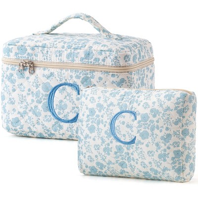 Narwey 2Pcs Initial Quilted Cotton Large Travel Cute Floral Coquette Makeup Cosmetic Toiletry Bag for Women Girls