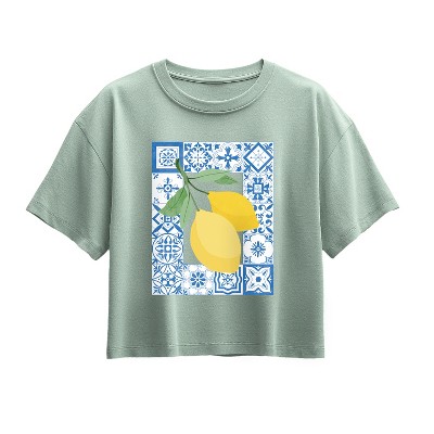 Girls' - Instant Message - Mediterranean Tiles With Lemons Short Sleeve Boxy Graphic T-Shirt