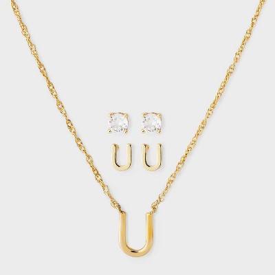 Brass Polished Letter Charm Necklace & Cubic Zirconia Stud Earrings 3pc Set - A New Day™ Gold