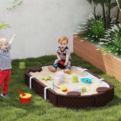Angel Sar Kids Sandbox with Cover, 4 Corner Seats, Bottom Liner for Backyard Garden Outdoor, Spacious Play Area, Brown