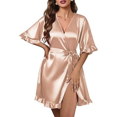 Ekouaer Women's Satin Robes Silk Bath Robe Short Ruffled Hem Bride Bridesmaid Sleepwear with Pockets
