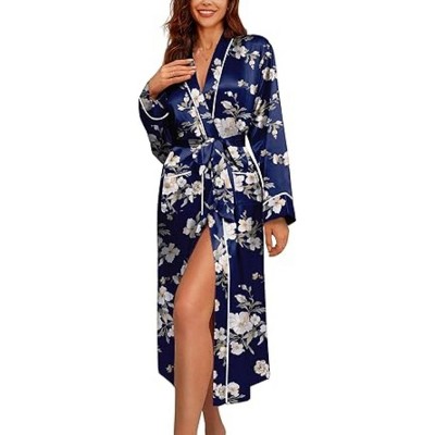 Anna-Kaci Lounge Women's Floral Print Satin Robe with Waist Tie Soft Silky Fabric Wide Sleeves and Flowing Longline Silhouette