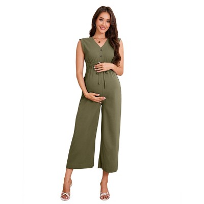 Clearlove Maternity Jumpsuit Dressy Front Button Summer Rompers Casual Wide Leg Pants Sleeveless V Neck Elegant One Piece Outfit