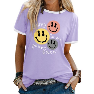 Nlife Women's Happy To See Your Face Print Ringer Round Neck Color Block Short Sleeve Casual Tee Shirt