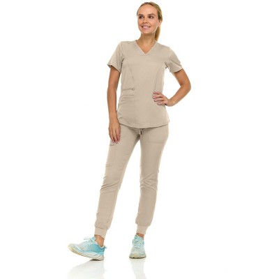 MediChic Scrubs for Women's V-Neck Scrub Set with Six Pocket Ribbed Cargo Jogger Pants with 4-Way Stretch