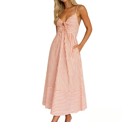Women Striped Spaghetti Strap Midi Dress Keyhole Cutout Elastic Waist Casual Dresses