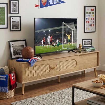 JVNOXK 70.80-inch Rattan-Style Media Entertainment Cabinet with Three Doors and Two Drawers, Suitable for TVs Under 80 Inches, Featuring LED Lighting