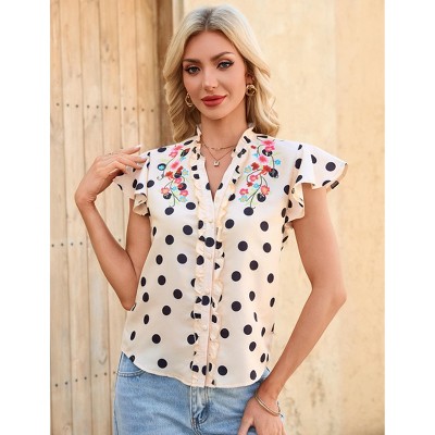 INSPIRE CHIC Women's Casual Ruffled Cap Sleeve Work Polka Dots Shirt Blouse