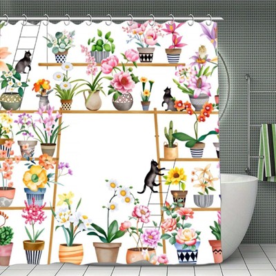 Whimsical Cats & Potted Plants Shower Curtain, Durable Polyester Bathroom Curtain for Indoor Garden Lovers 70.8x70.8 Iniches