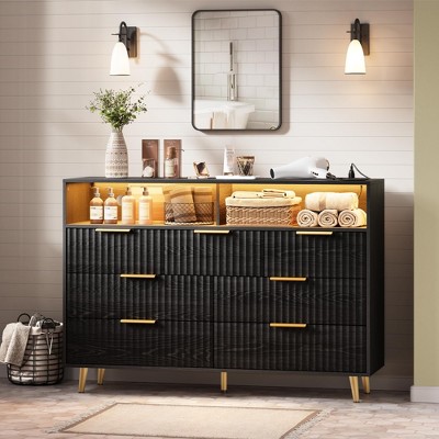 54" Modern Fluted 7-Drawer Dresser w/Lights & Charging Station,Wide Chest of Drawers w/ Open Shelf & Gold Handles for Bedroom/Hallway