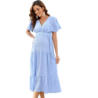 Women's Maternity Short Sleeve Summer Smocked Dress V Neck Boho Ruffle Casual Swing Midi Dress Baby Shower Photoshoot