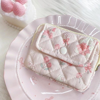 Narwey Cotton Quilted Floral Coin Pouch with Cute Prints Zipper for Women Girls (PINK TULIP)