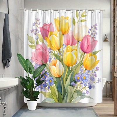 Lomsoe 1PC Colorful Floral Pattern Shower Curtain Featuring Design of Tulips And Daisies, Stylish Theme, Includes 12 Hooks.