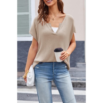 Women's Waffle Sweater Knit V-Neck Shirt Dolman Short Sleeve Top Loose Fit Split Hem Tunic Blouse