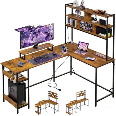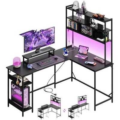 DEXYLLO L Shaped Gaming Desk with Hutch, Reversible Computer Desk with LED Light, 3-Tier Shelves, 2 AC+2 USB Outlet and Monitor Stand
