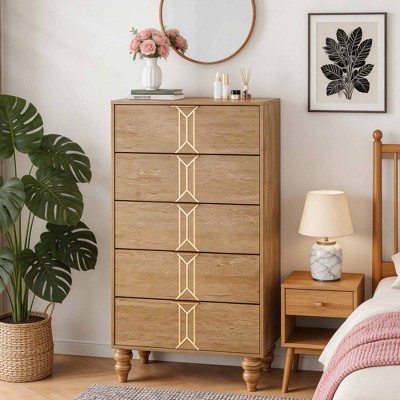 Tall Rattan Dresser with 5 Drawers,Wooden Spacious Storage Chest of Drawers with Wide Top,Handles,Easy to Assemble,Modern Dresser