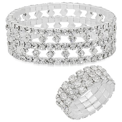Steeltime Ladies sterling silver plated stretch double layered bracelet and ring set with simulated diamonds