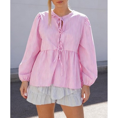 Women's Tie Front Striped Shirt Summer Trendy Fashion Cute Babydoll Tops Peplum Long Sleeve Blouse