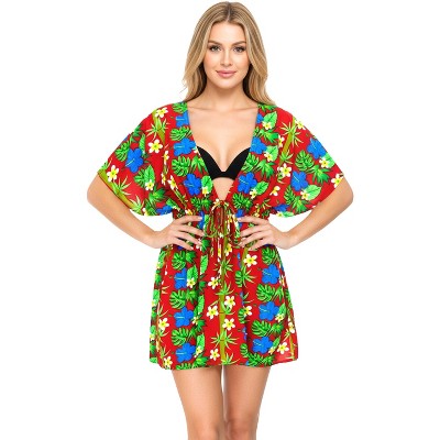 LA LEELA Womens Summer Mini Beach Tropical Dress Swimsuit V Neck Tops Cover Ups for Swimwear for Women XL-XXL Red, Floral