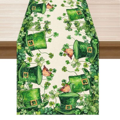 Watercolor Green Hats Shamrocks Clovers Cardinals Birds St. Patrick's Day Table Runner