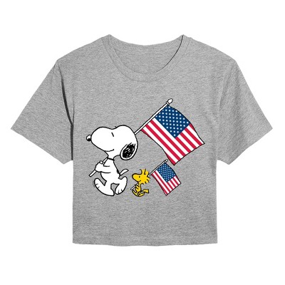 Women's Peanuts Snoopy & Woodstock USA Flags Cropped Graphic T-Shirt - Heather Grey - Medium