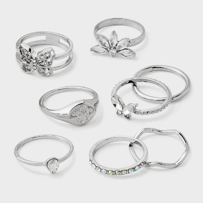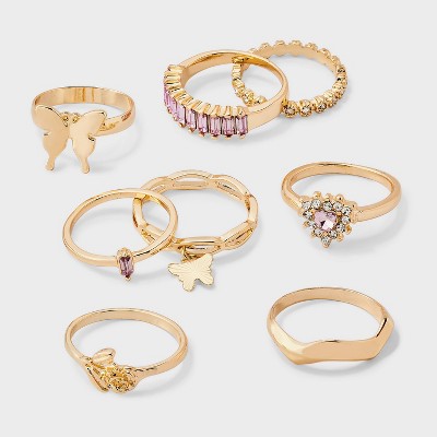 Crystal Floating Butterfly Ring Set 8pc- Wild Fable™ Gold: Stacking Rings, Recycled Zinc, Sizes 6-8