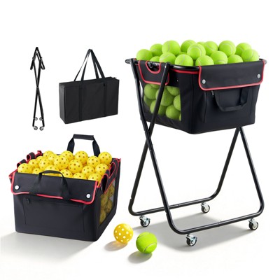 VEVOR Tennis Ball Hopper, Holds 120 Tennis Balls, Foldable Pickleball Basket Cart with Wheels for Easy Pick Up, Lightweight Aluminum Alloy, Black