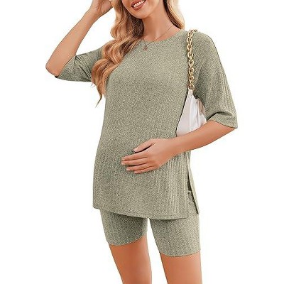 Ekouaer Women Maternity Sets 2 Piece Outfits Short Sleeve Shirts and Biker Shorts Pregnancy Loungewear Mama Clothes