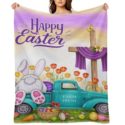 Lomsoe 1pc Easter Patterned Blanket Easter Bunny & Floral Print Egg Print Flannel Blanket ¨C Soft, Cozy, All-Season Throw for Sofa.