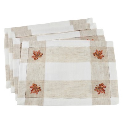 Saro Lifestyle Embroidered Leaf Hemstitch Placemat, 14"x19" Oblong, Ivory (Set of 4)