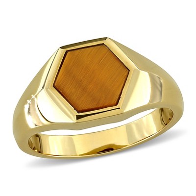 Steeltime men's Italian 14k gold plated sterling silver and tiger eye ring with greek key accents