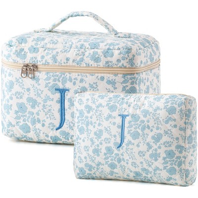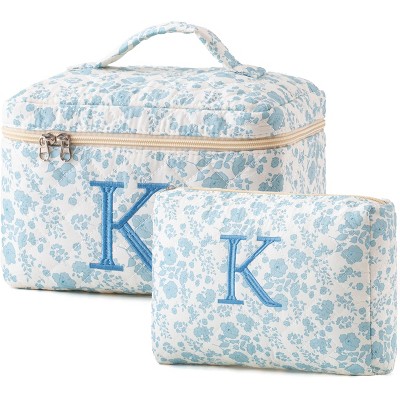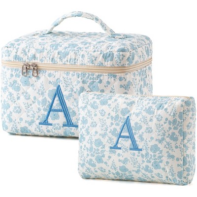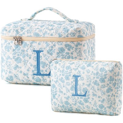 Narwey 2Pcs Initial Quilted Cotton Large Travel Cute Floral Coquette Makeup Cosmetic Toiletry Bag for Women Girls
