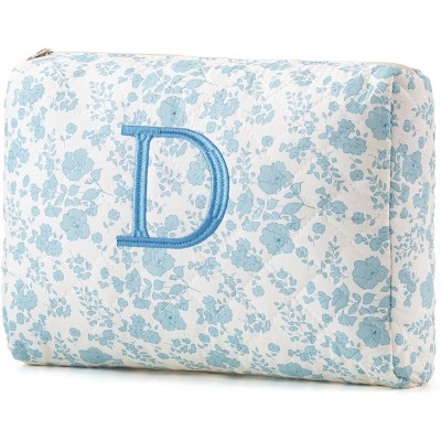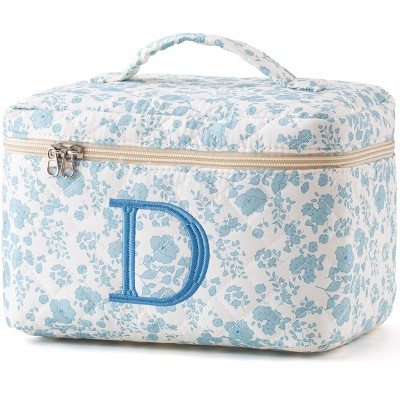 Narwey Initial Quilted Makeup Bag, Cotton Large Travel Makeup Bag, Cute Floral Coquette Make up Bag Cosmetic Bag Toiletry Bag for Women Girls D