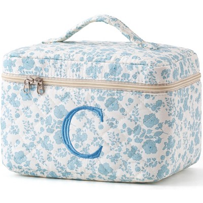 Narwey Initial Quilted Makeup Bag, Cotton Large Travel Make up Bag, Cute Floral Coquette Cosmetic Bag Toiletry Bag for Women Girls C