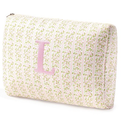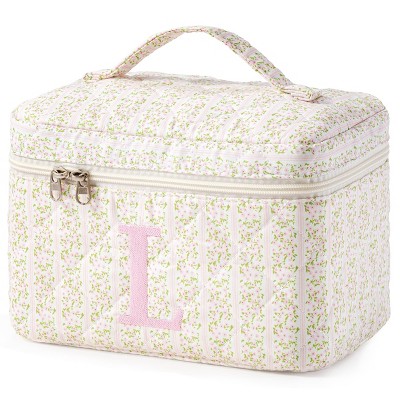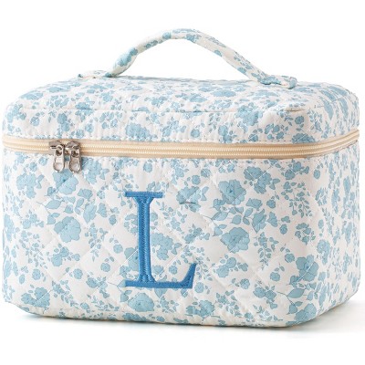 Narwey Initial Quilted Makeup Bag, Cotton Large Travel Makeup Bag, Cute Floral Coquette Make up Bag Cosmetic Bag Toiletry Bag for Women Girls L