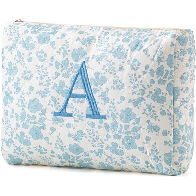 Narwey Initial Quilted Makeup Bag, Cotton Large Travel Make up Bag, Cute Floral Coquette Cosmetic Bag Toiletry Bag for Women Girls A