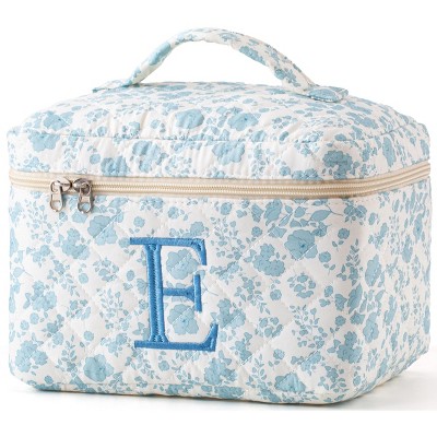 Narwey Initial Quilted Makeup Bag, Cotton Large Travel Make up Bag, Cute Floral Coquette Make up Bag Cosmetic Bag Toiletry Bag for Women Girls E