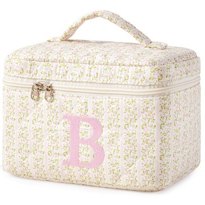 Narwey Initial Quilted Makeup Bag, Pink Cosmetic Travel Toiletry Bag, Flowers Coquette Zipper Make Up Pouch Organizer Teen Girl Gift Trendy Stuff B