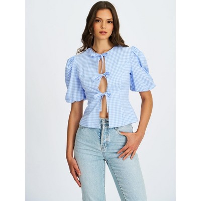 Miss Circle Qusayla Baby Blue Gingham Bubble Sleeve Bowtie Top