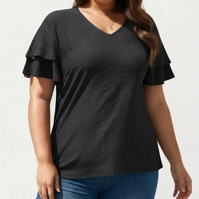 Anna-Kaci Women's Plus Size Short Sleeve V Neck Top with Textured Knit Fabric Tiered Ruffle Sleeves Relaxed Fit Lightweight Shirt